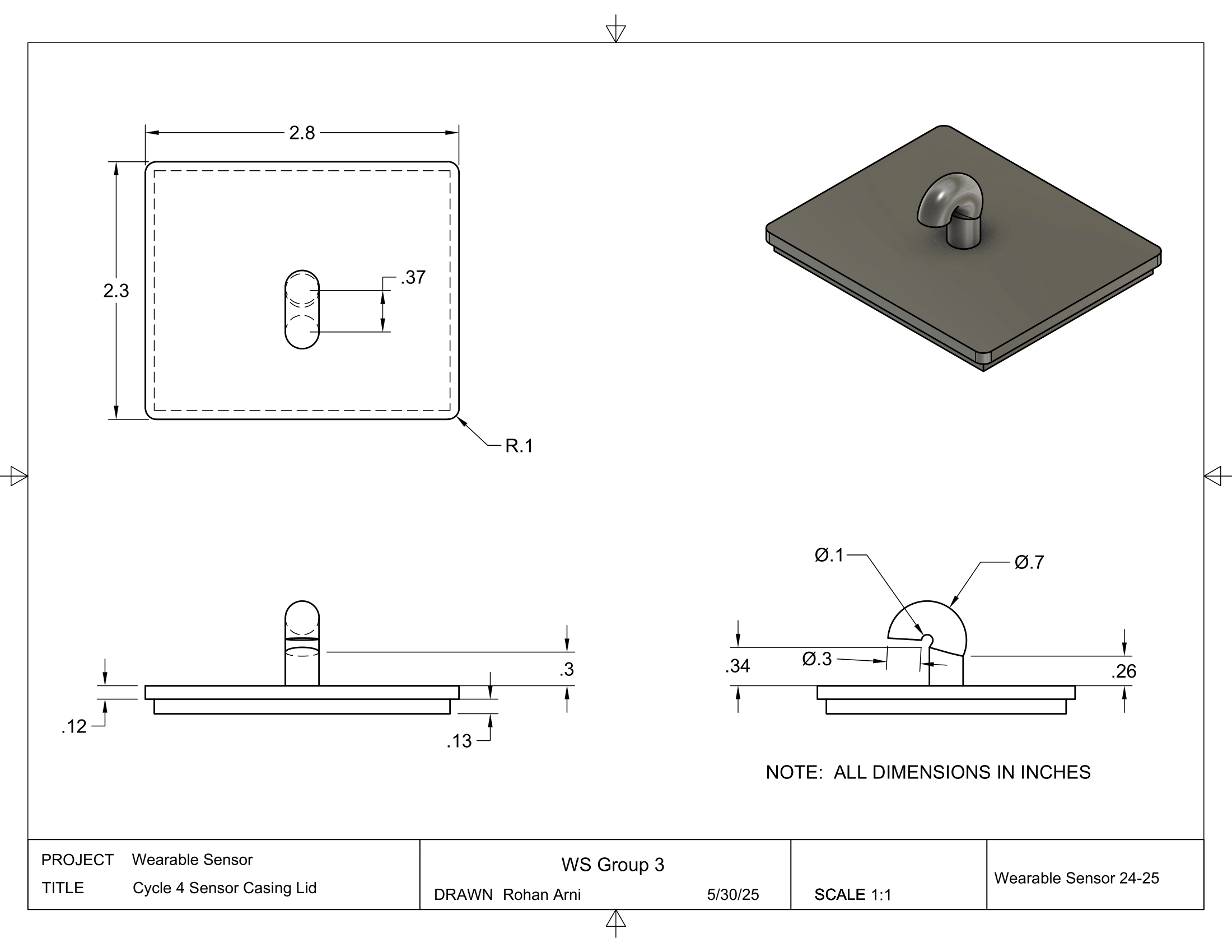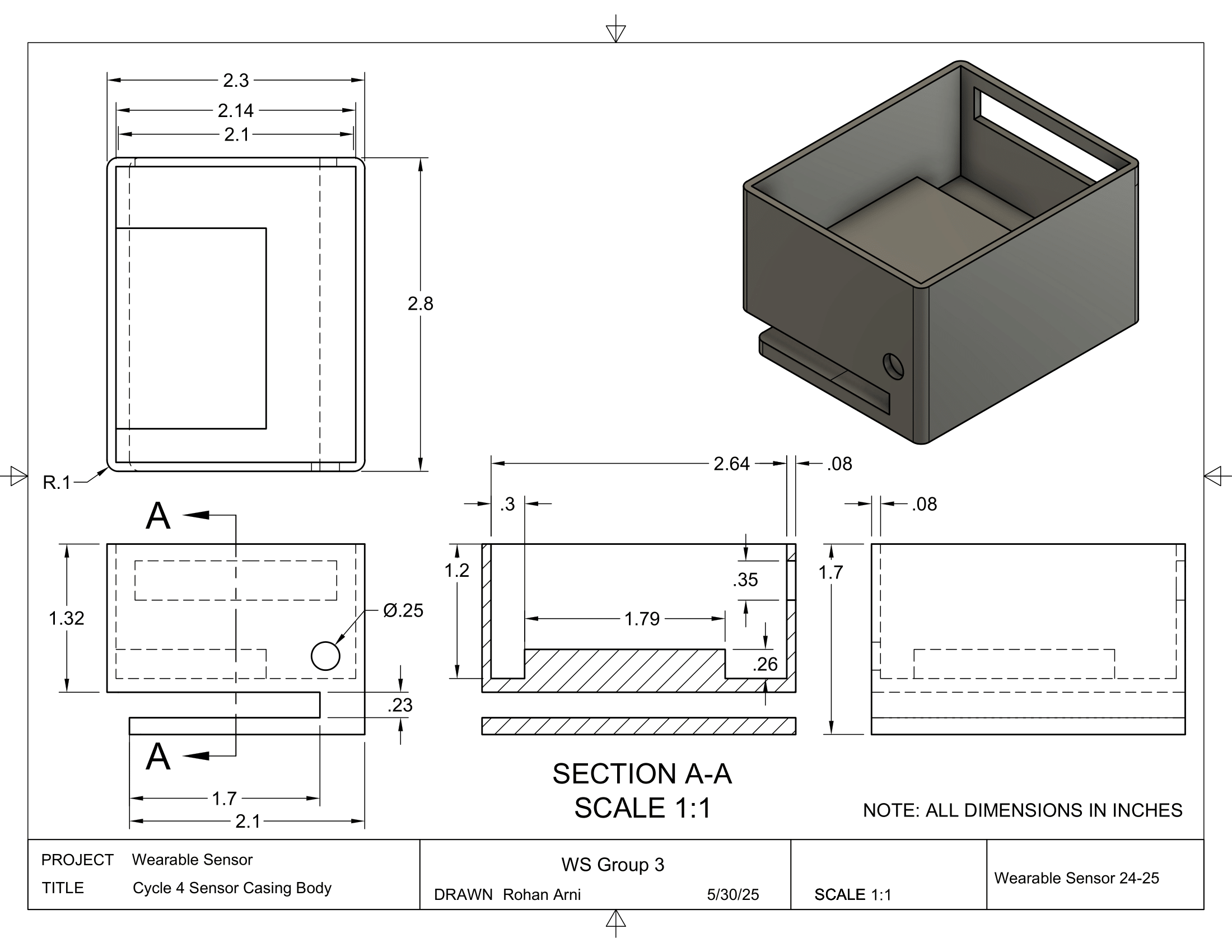 We first used Fusion 360, a Computer Aided Design (CAD) tool, to design our sensor. We dimensioned each part to use, then drew up the design, combined the parts together into an exploded view, then downloaded each 3D printed part as a .stl file to send to the 3D printer.