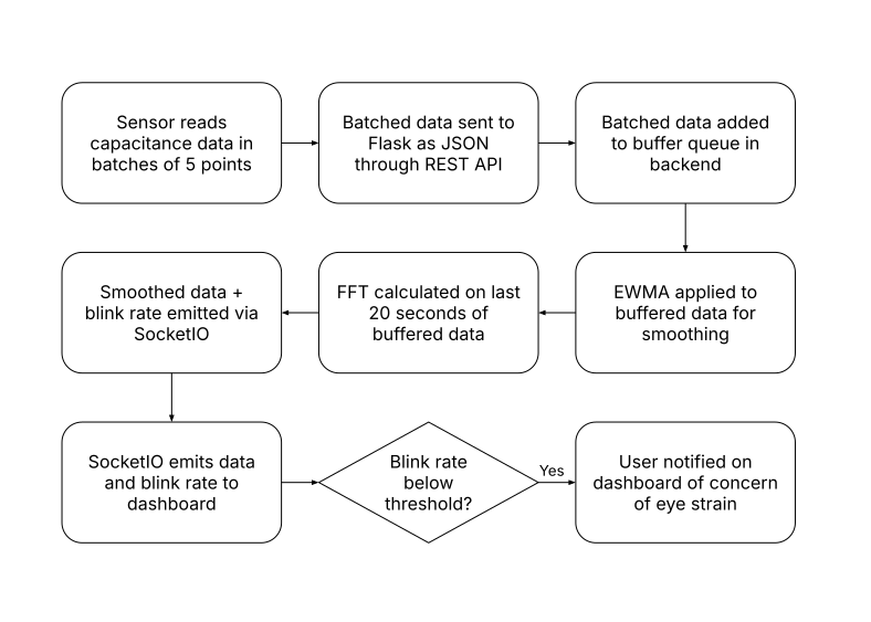 Once the wearable sensor begins running, the Arduino runs C++ code to take the capacitance sensor data. This data is then sent to the user's computer, where the Python library numpy is then used to implement a Fast Fourier Transform (FFT) to detect blinks.